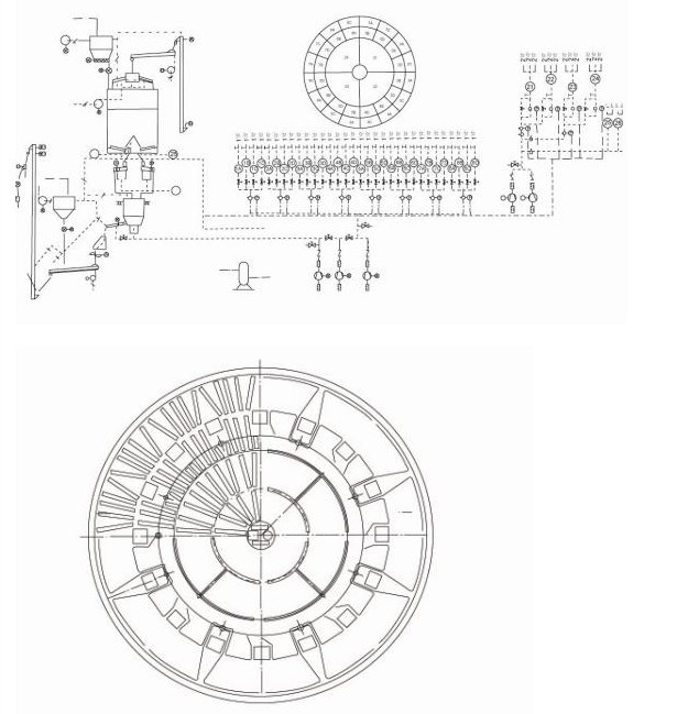 CP生料均化庫為一種新型生料均化庫,具有電耗低、均化效果好等特點。CP生料均化庫是庫頂生料通過8條斜槽均勻布料,不同時期的生料在庫內呈橫向分布,庫底充氣系統設計更符合生料充氣后的流動性,呈放射狀斜向分布,環形區一般分8個區,每隔5分鐘輪流充氣,充氣區生料因松動及氣流的引導卸入中心區,庫內不同層的生料豎向切割下料實現生料 的均化,不同時間的生料進入中心區后再進行氣體強烈混合均化,從而達到理想的均化效果。