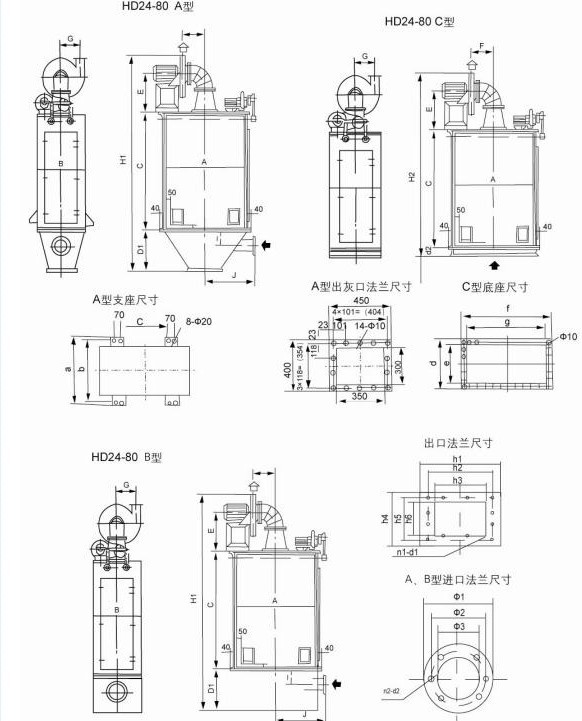 HD型袋式除塵器有六種規格:分A、B、C三型,A型設灰門、B型設抽屜,C型既不設灰門也不帶抽屜,下部加法蘭根據用戶要求直接配接在庫頂、料倉、皮帶運辦機等揚塵設備上就地除塵,粉塵直接回收。