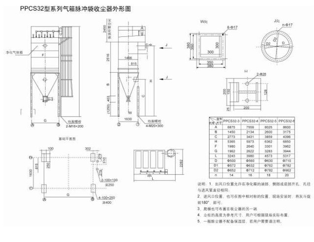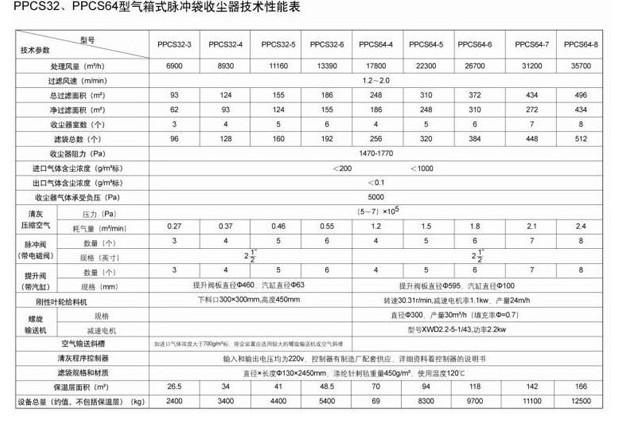 氣箱脈沖袋式收塵器由殼體、灰斗、排灰裝置,支架和脈沖清灰系統(tǒng)等部分所組成。當(dāng)含塵氣體從進(jìn)風(fēng)口進(jìn)入收塵器后,先碰到進(jìn)出風(fēng)口中間的斜隔板,氣流便轉(zhuǎn)向流入灰斗,同進(jìn)氣流速度變慢,由于慣性作用,使氣體中粗顆粒粉塵直接落入灰斗,起到預(yù)收塵的作用,進(jìn)入灰斗的氣流隨后折而向上通過內(nèi)部裝有金屬骨架濾袋,粉塵被捕集在濾袋的外表面,凈化后的氣體進(jìn)入濾袋室上部的清潔室,匯集到出風(fēng)管排出PPCS型收塵器的進(jìn)風(fēng)口設(shè)在灰斗上,氣流進(jìn)入灰斗后先碰上進(jìn)風(fēng)管端部的擋板,其作用與上述原理相同。殼體用隔板分成若干個(gè)獨(dú)立的收塵室,按照給定的時(shí)間間隔對(duì)每個(gè)收塵室輪流進(jìn)行清灰。每個(gè)收塵室裝有一個(gè)提升閥,清灰時(shí)提升閥關(guān)閉,切斷通過該收塵室的過濾氣流,隨即脈沖閥開啟,向?yàn)V袋內(nèi)噴人高壓空氣,以清除濾袋外表面上的粉塵。各收塵室的脈沖噴吹寬度和清灰周期,由清灰程序控制器自動(dòng)連續(xù)進(jìn)行。